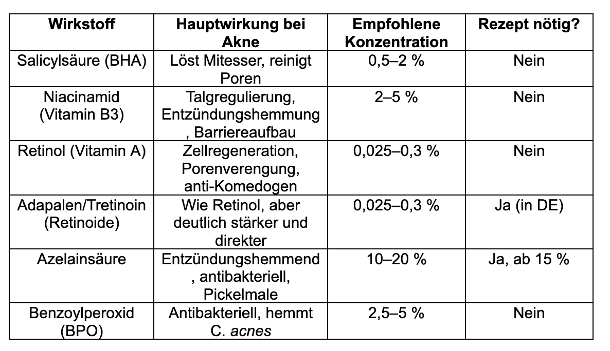 Azelainsäure ist in Konzentrationen von 10–15 % frei verkäuflich, während höhere Konzentrationen von 15–20 % verschreibungspflichtig sind – ein Unterschied, der klinisch gut belegt ist.