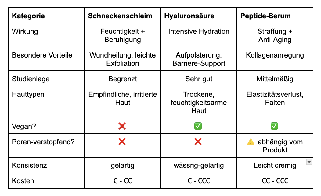 Alternative: Wenn Du ein veganes Pendant dazu suchst, ist reine Hyaluronsäure eine hervorragende Alternative. Sie ist einer der Hauptwirkstoffe des Schneckenschleims, nur ohne tierische Bestandteile und ohne “Ekel-Faktor“.